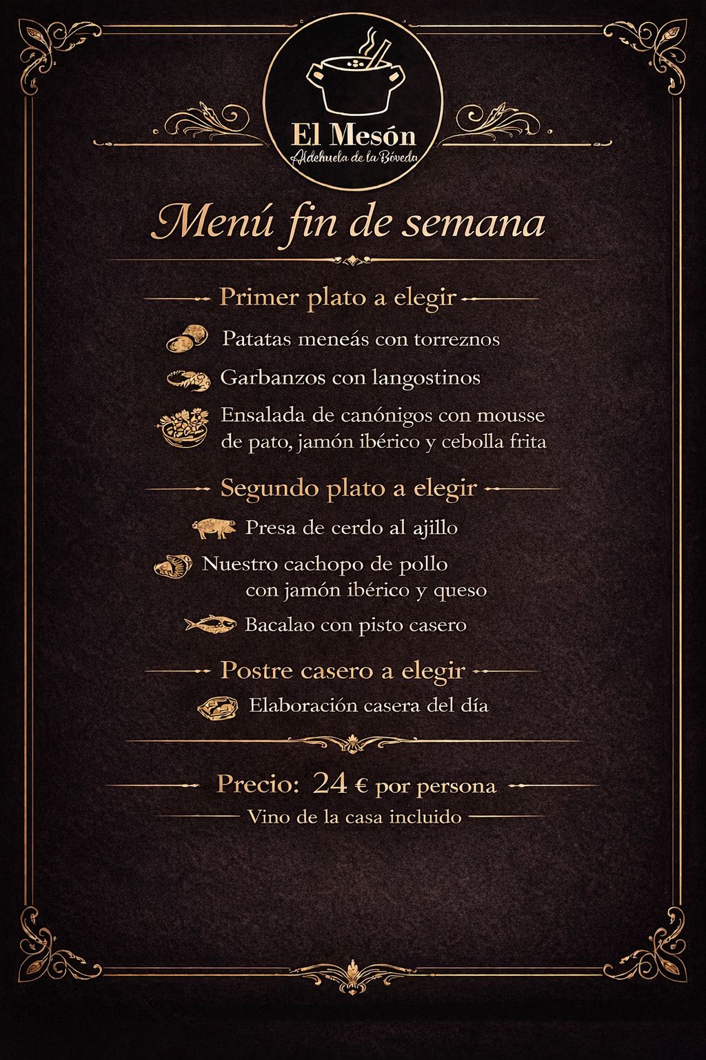 El primero de los menús de fin de semana, con un precio de 24 euros por persona que incluye vino de la casa, ofrece platos que reflejan el carácter tradicional de su cocina. Entre los primeros a elegir destacan patatas meneás con torreznos, garbanzos con langostinos o ensalada de canónigos con mousse de pato, jamón ibérico y cebolla frita. Como segundos, los comensales podrán optar por presa de cerdo al ajillo, cachopo de pollo con jamón ibérico y queso o bacalao con pisto casero, finalizando con postre casero del día.