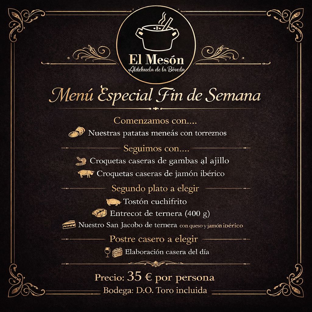 La segunda propuesta es un menú especial de 35 euros por persona, que incluye vino con denominación de origen Toro. En este caso, la experiencia comienza con patatas meneás con torreznos, para continuar con croquetas caseras de gambas al ajillo o de jamón ibérico. Como plato principal, se puede elegir entre tostón cuchifrito, entrecot de ternera de 400 gramos o un San Jacobo de ternera con queso y jamón ibérico, terminando también con postre casero del día.